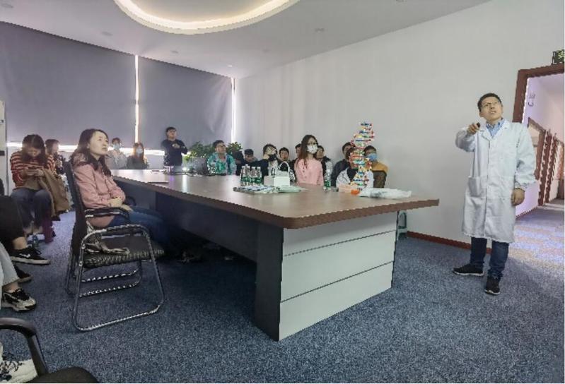 在社会实践活动中,同学们认真聆听了云奥生物科技技术负责人王锐和郭人铭对病毒、新冠病毒、DNA、RNA、抗体等相关生物化学知识的讲解,了解了病毒的种类、新冠病毒的繁殖过程和当前疫情的严重情况等,并学习了核酸检测的相关设备、检测对象及方法、以及获得诺贝尔奖的最新检测技术。在工作人员的指导下,部分同学还亲自操作了新冠病毒及抗原抗体的检测实验。最后,同学们还参观了实验室、洁净室等研发场所,本次实践活动取得圆满成功。