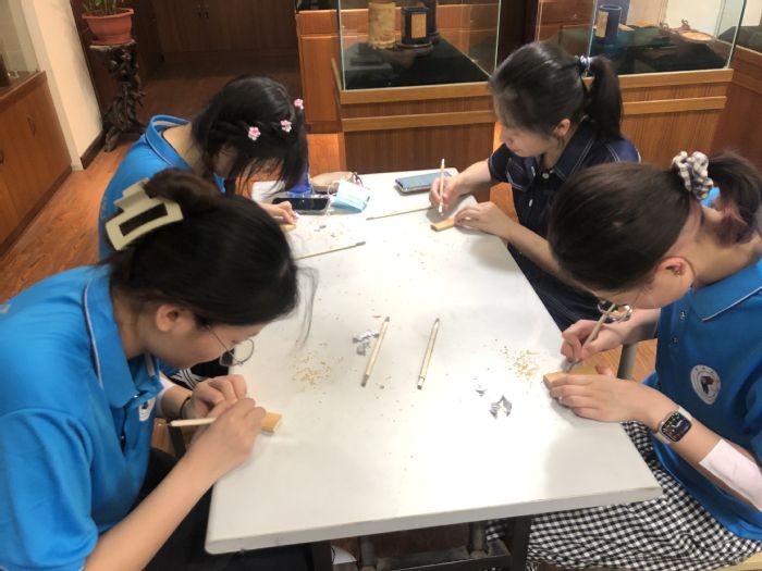 第三站,团队成员来到了常州白氏留青竹刻博物馆,在白氏传承人白雪飞老师的悉心讲解与指导下,实践团队参观了白氏留青竹刻的馆藏作品,尝试了留青竹刻的切线、铲底、刮底……,感受给竹片做“减法”的不易,深刻体会到白雪飞父女为传承留青竹刻的信念和坚持。
