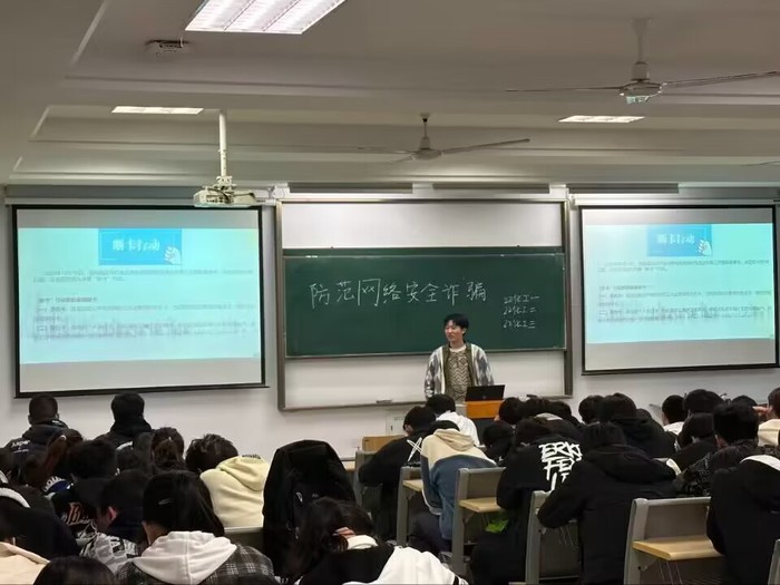 为深入开展校园防诈宣传,3月22日晚,tyc41183太阳成集团22级全体员工在天枢楼参加防范电信网络诈骗教育宣讲会。