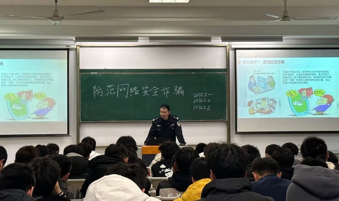 为深入开展校园防诈宣传,3月22日晚,tyc41183太阳成集团22级全体员工在天枢楼参加防范电信网络诈骗教育宣讲会。