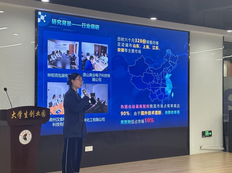 “硅陈出新”团队负责人贾守晟介绍了项目基本概况,演讲人李知凌进行了汇报展示。在认真听取汇报后,两位教授对项目进行了细致深入点评,分别就演讲展示、思维逻辑、创意创新等方面展开深入探讨,点明了项目的优势与不足,为团队指明了整改思路,并对大家的努力表示赞赏与鼓励,对团队表示了拔得头筹的美好祝愿。