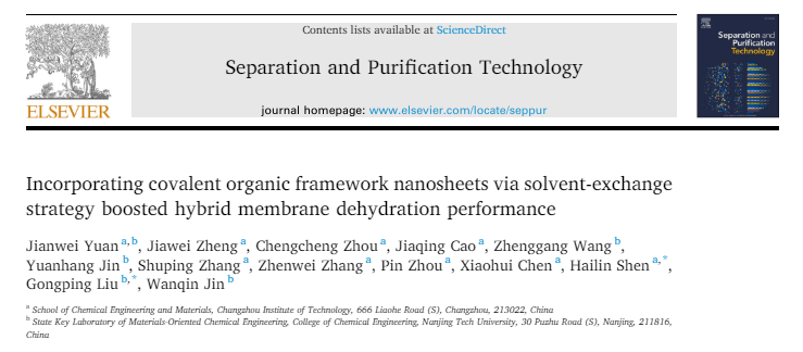 上述工作得到了国家自然科学基金青年基金项目(22208033)、江苏省高等公司自然科学基金项目(22KJB530005)、常州市基础研究计划 (CJ20230039)等项目的支持。《Separation and Purification Technology》是由荷兰Elsevier出版集团发行,致力于传播化学工程和环境工程中均质溶液和异质混合物的分离和纯化新方法的国际著名期刊,中科院SCI工程技术一区TOP期刊,影响因子为9.136。