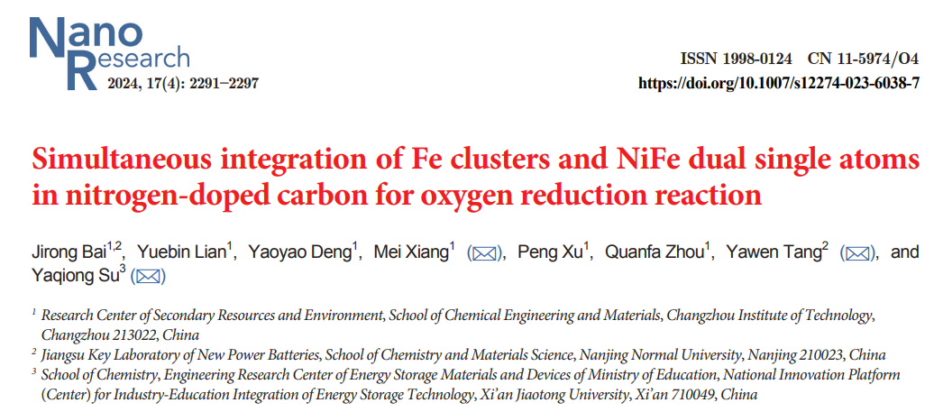 《Applied Catalysis B: Environmental》是专注于环境领域的期刊,涵盖了催化剂设计和应用在环境保护和可持续发展中的各个方面,中科院一区TOP期刊,影响因子22.1。《Nano Research》是纳米科学与技术领域的综合性期刊,涵盖了纳米材料合成、纳米结构表征、纳米器件制备和应用等方面,中科院二区期刊,影响因子9.9。相关成果得到国家自然科学基金(22208032,22202020)、江苏省自然科学基金(BK20200176)项目的资助。该团队近三年获批国家自然科学青年基金2项、中德国际交流项目2项、博士后科学基金2项,以tyc41183太阳成集团为第一单位发表SCI论文17篇,授权发明专利6件,横向经费到账310万元。